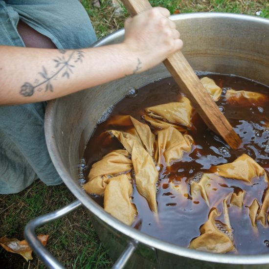 ♥ Vous pouvez venir avec votre tissu, lin ou coton, non neuf (effectivement, les vêtements neufs sont pleins de produits, la teinture naturelle ne fonctionnera pas), si vous n’en avez pas, je peux vous fournir des tissus à teindre.