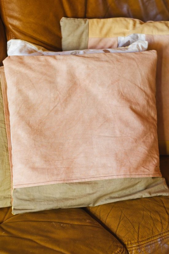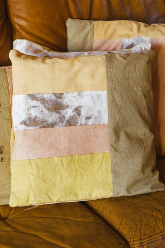 Les tissus utilisés sont deux anciens draps, tout deux teint avec les plantes. Les couleurs sont douces, originales, durable et s’accordent facilement.